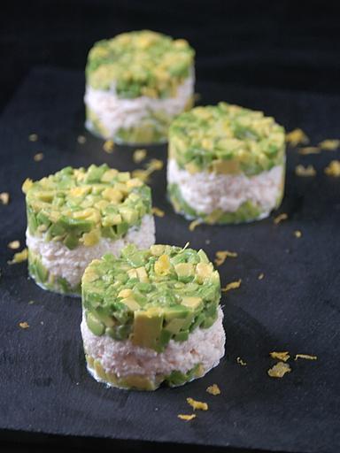 Dans un ramequin, mettre une bonne couche de crabe puis couvrir d'avocat.